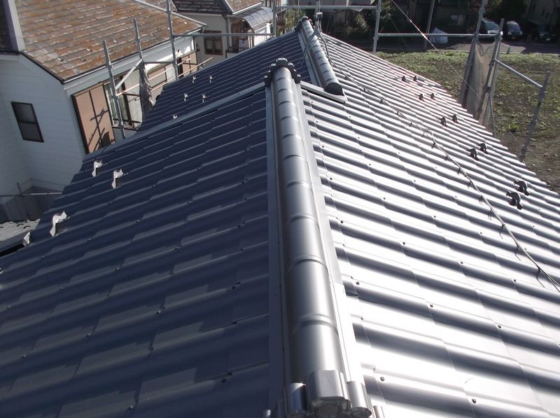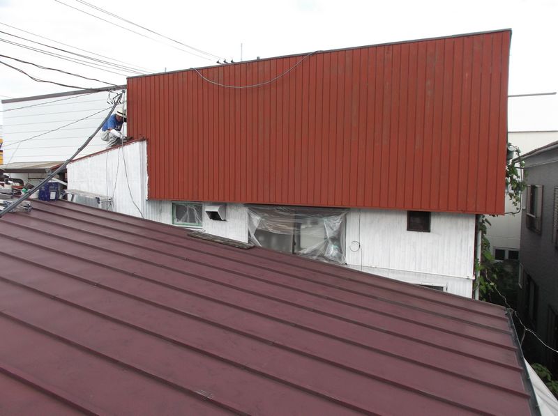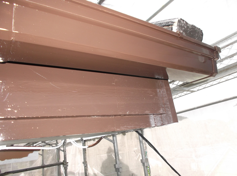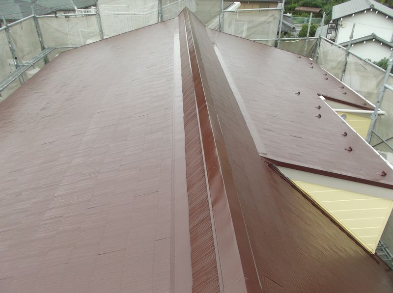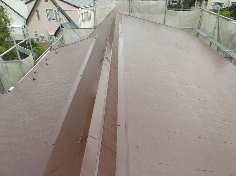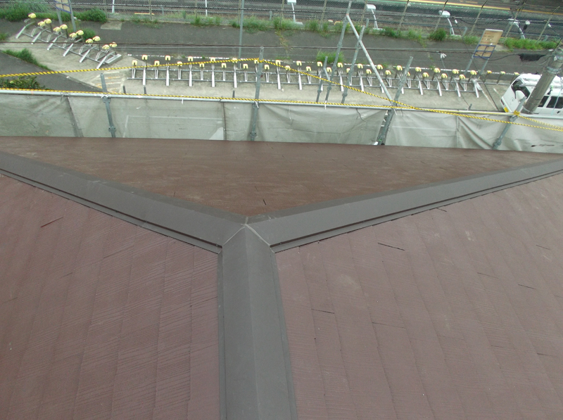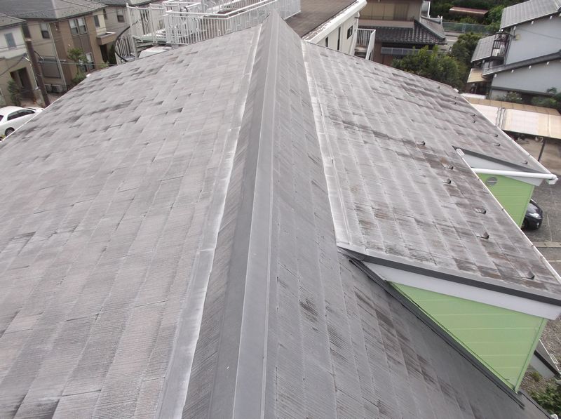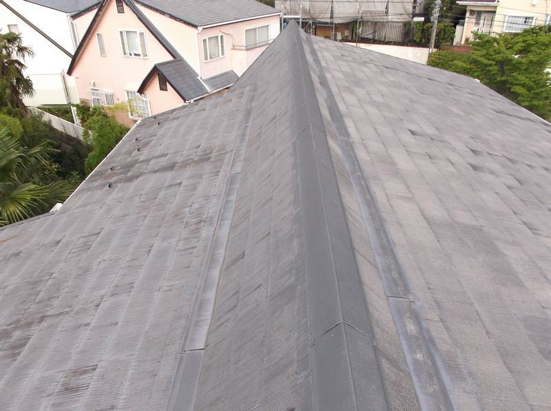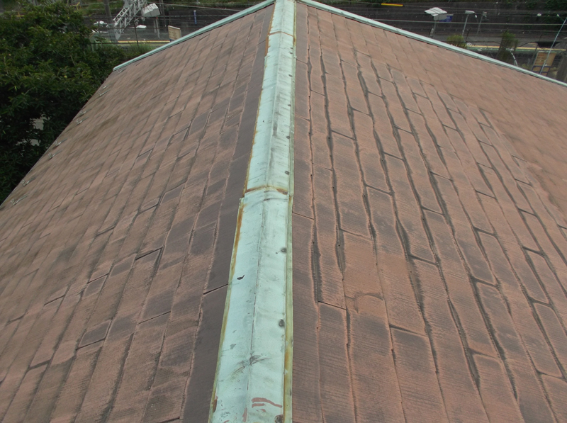 様です。点検してみると塗膜剥離・しみ・チョーキング・棟押さえ板金の湾曲・下地
