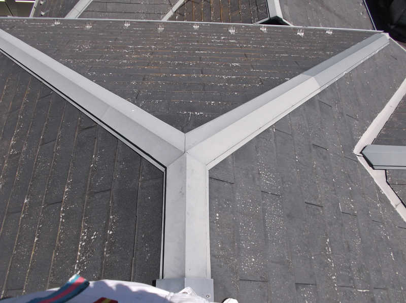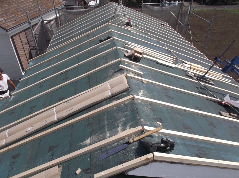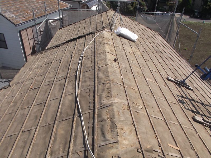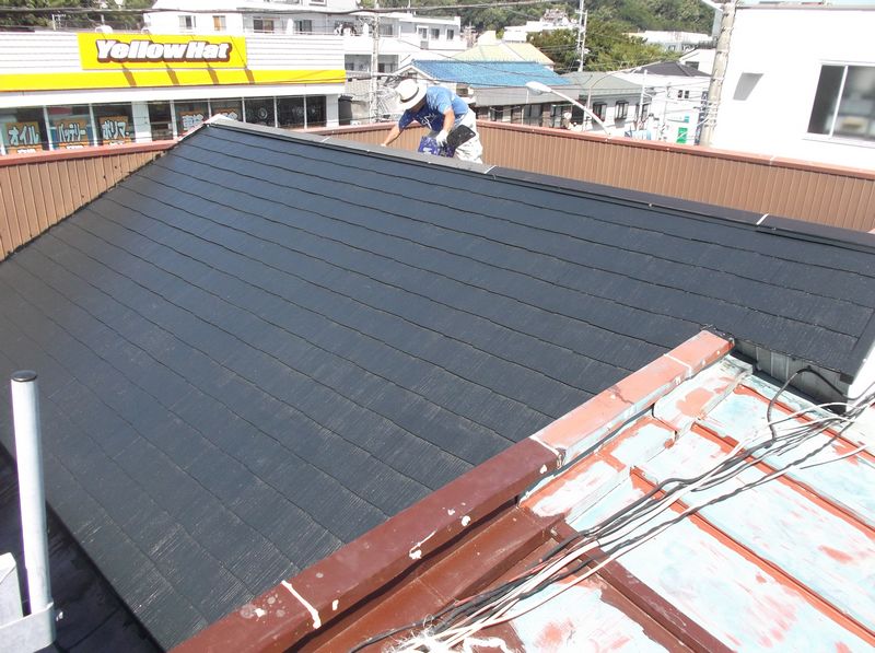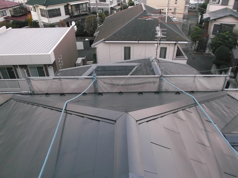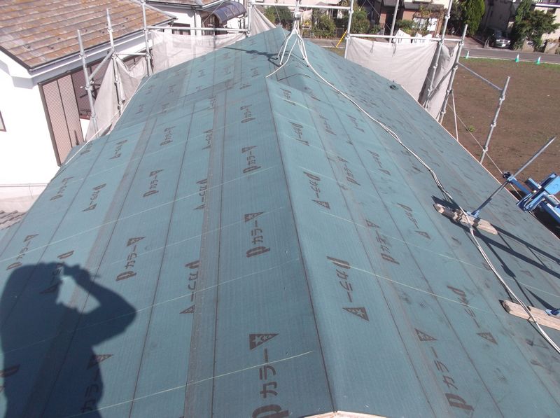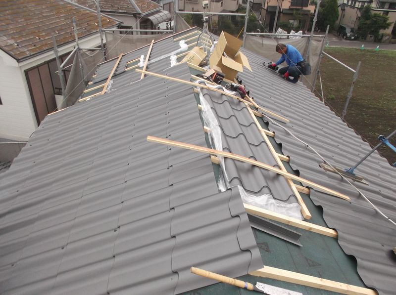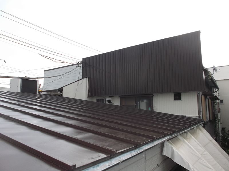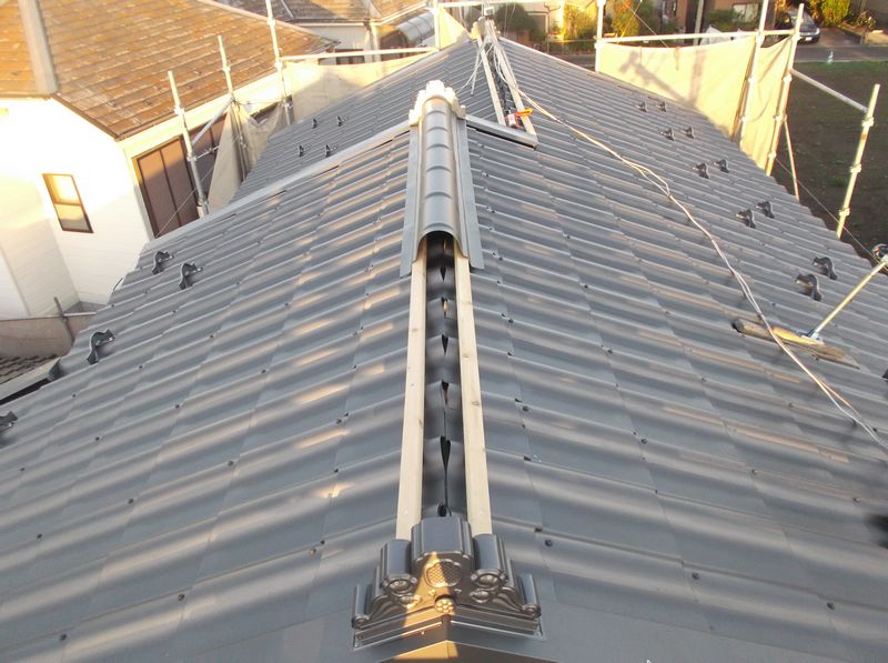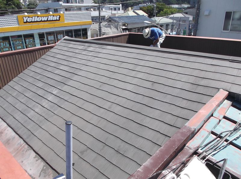 様です。点検してみると塗膜剥離・しみ・チョーキング・棟押さえ板金の湾曲・下地